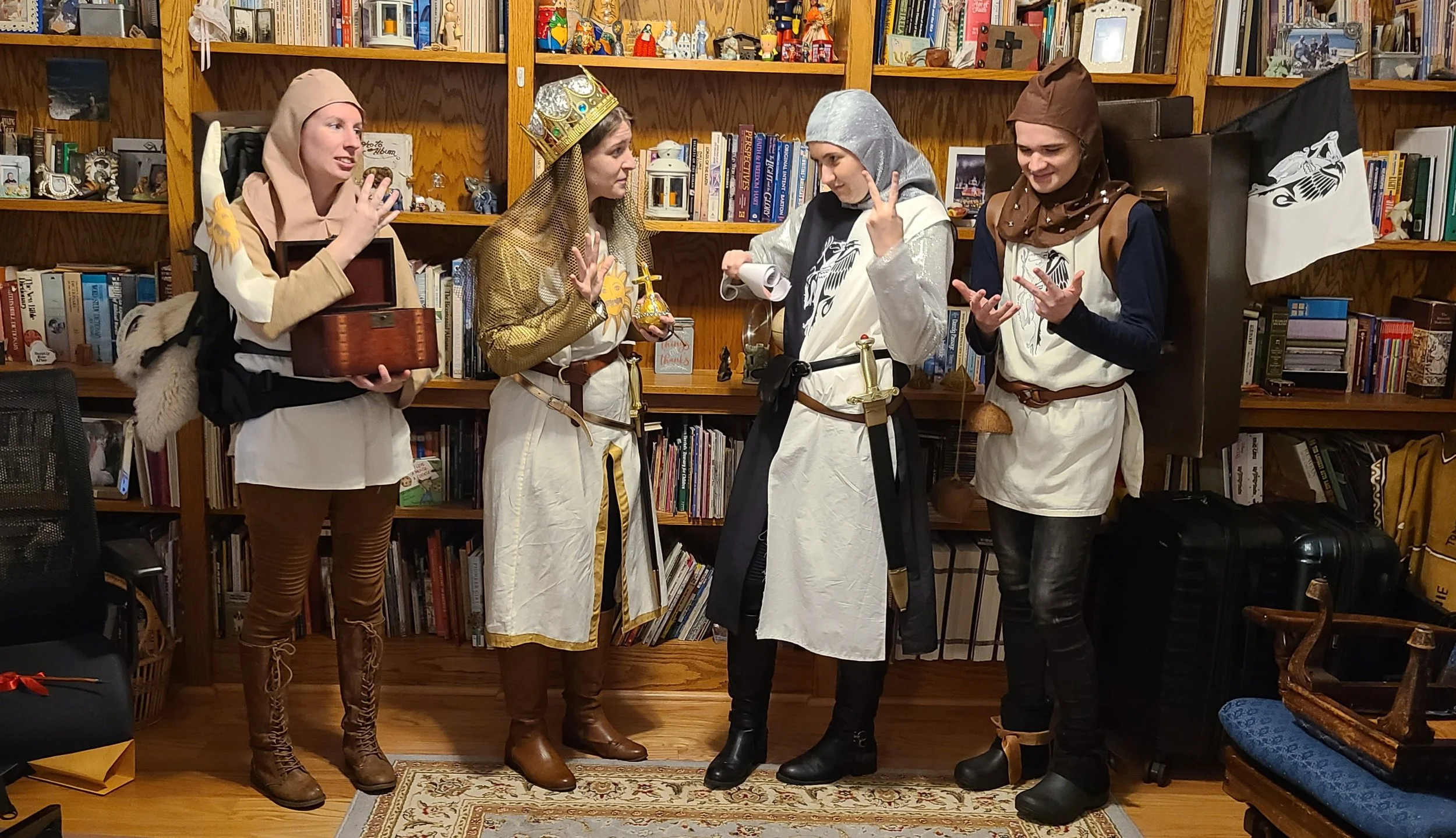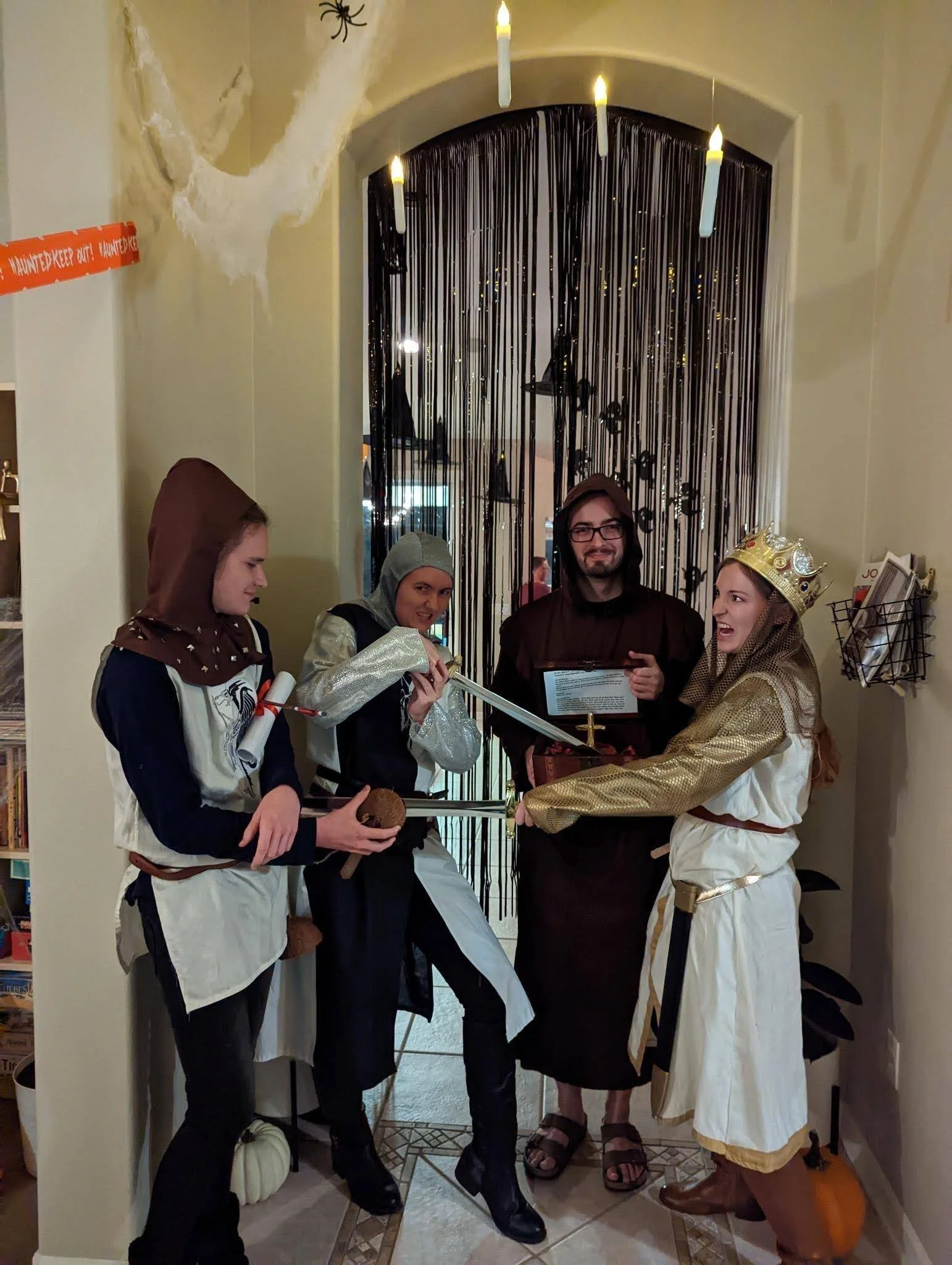 L to R: Sir Lancelot, Concorde, Patsy, & King Arthur posing for our costume contest entry