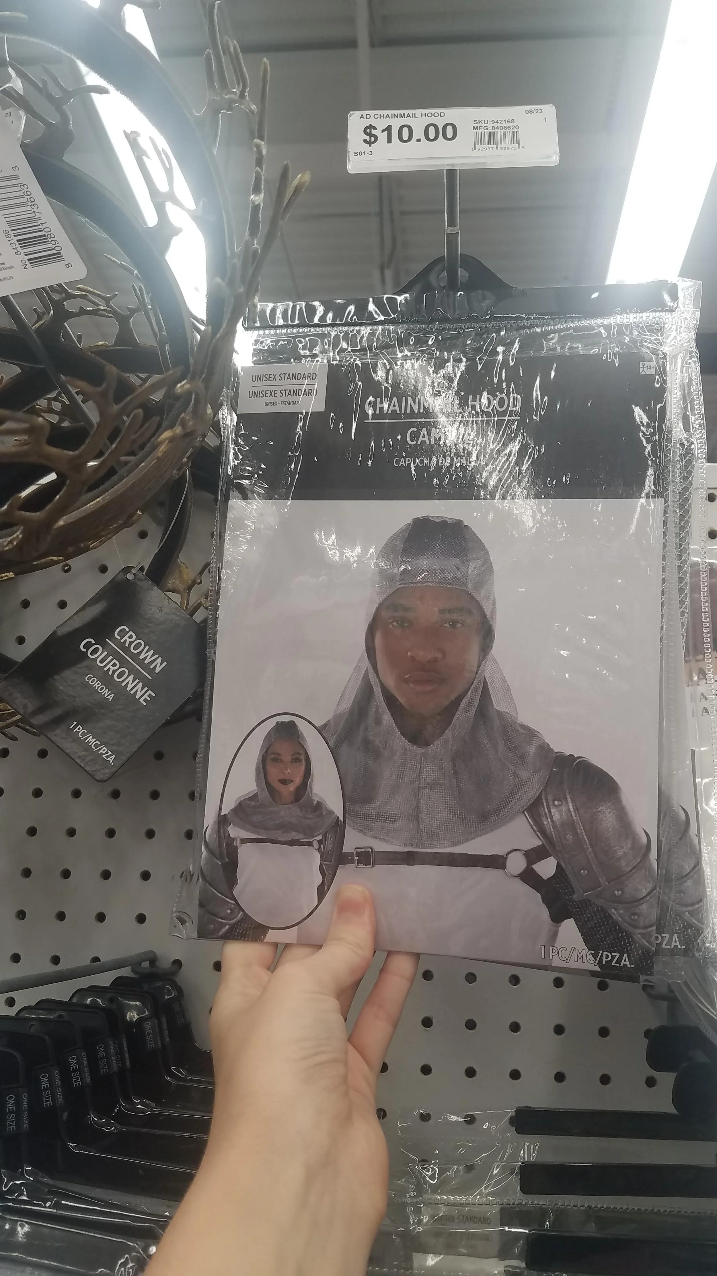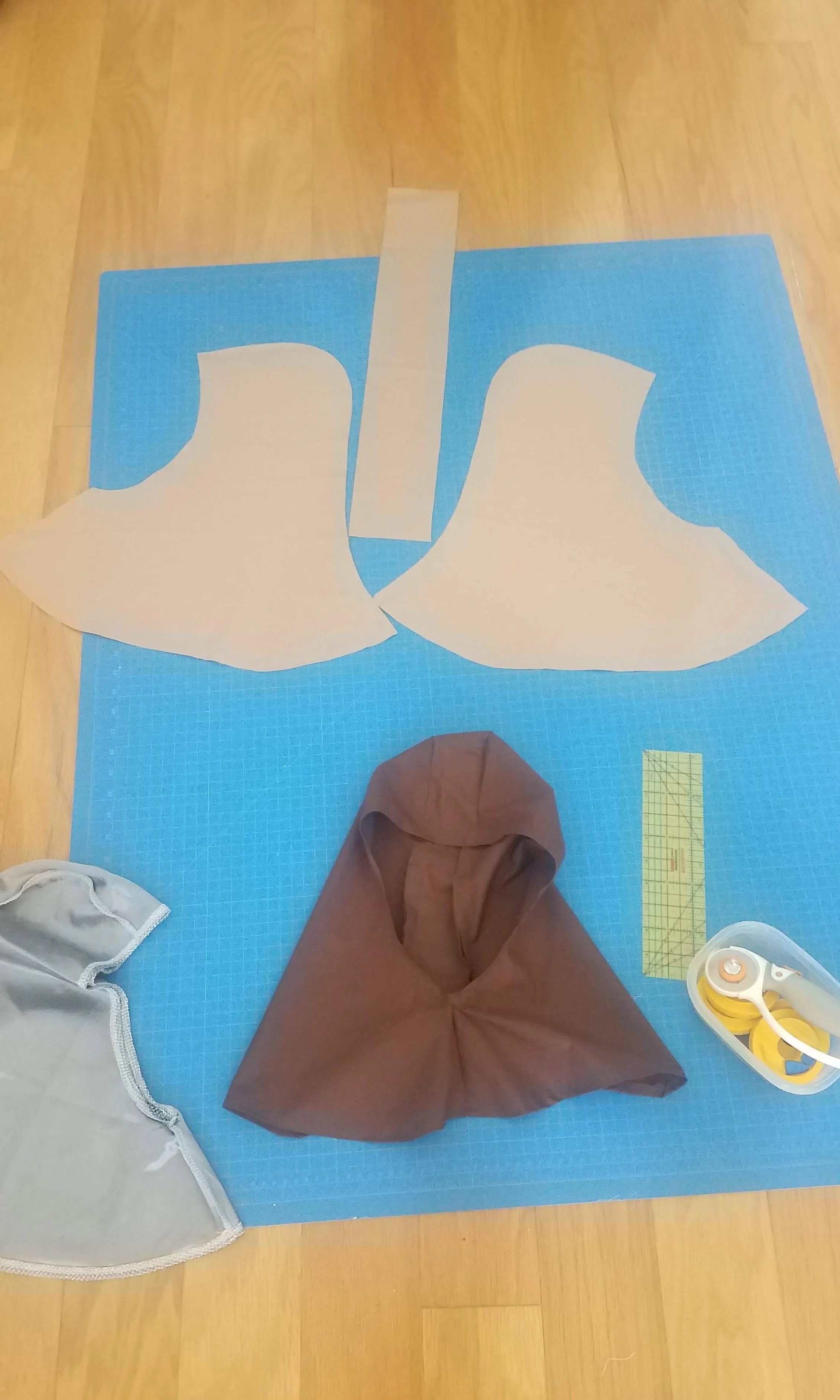 My next challenge was making hoods for Lancelot, Patsy, and Concorde. It was a different shape from the Loki costume I made last year so I couldn’t reuse that pattern. I ended up finding a “chainmail” hood for just $10 at Party City that was perfect for Lancelot so I bought it and used it to trace the other 2 hoods by flipping it inside out and measuring the length and width of the rectangular piece.