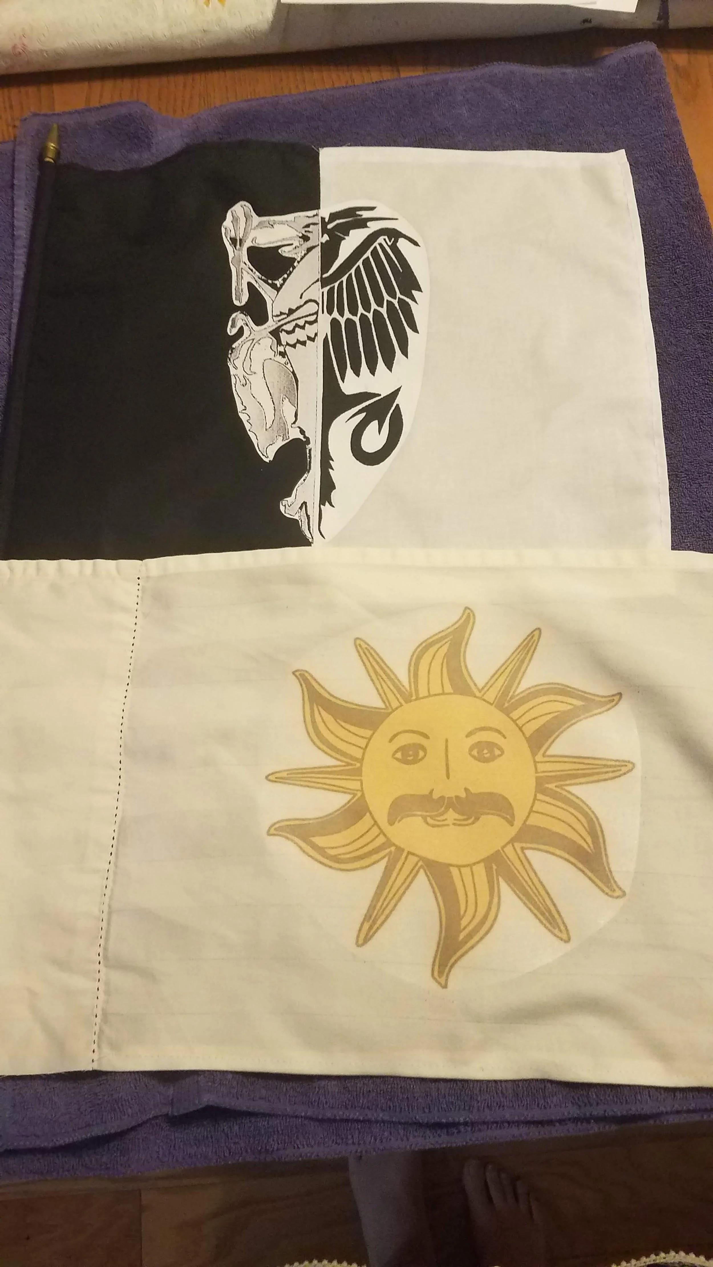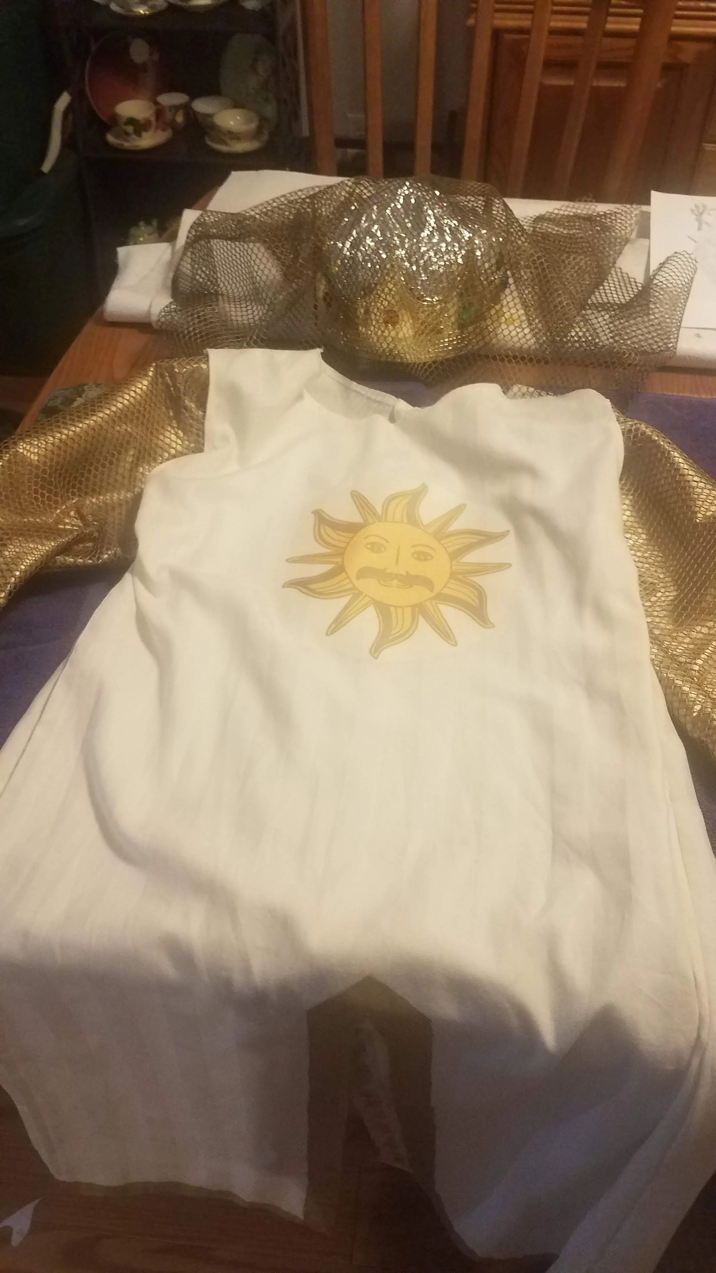 Once it arrived, I followed the instructions carefully so I wouldn’t mess up and printed the designs I found after much searching on Google images. I decided to test the results by making the flags (carried by Patsy & Concorde) first. I used the light fabric transfer paper for the sun and dark fabric transfer paper for the griffin (it leaves the white background instead of turning it transparent). Once I was satisfied with the results, I ironed them on Patsy & Concorde’s tunics. I decided to hold off on King Arthur and Sir Lancelot’s until after I made the “chainmail” sleeves.