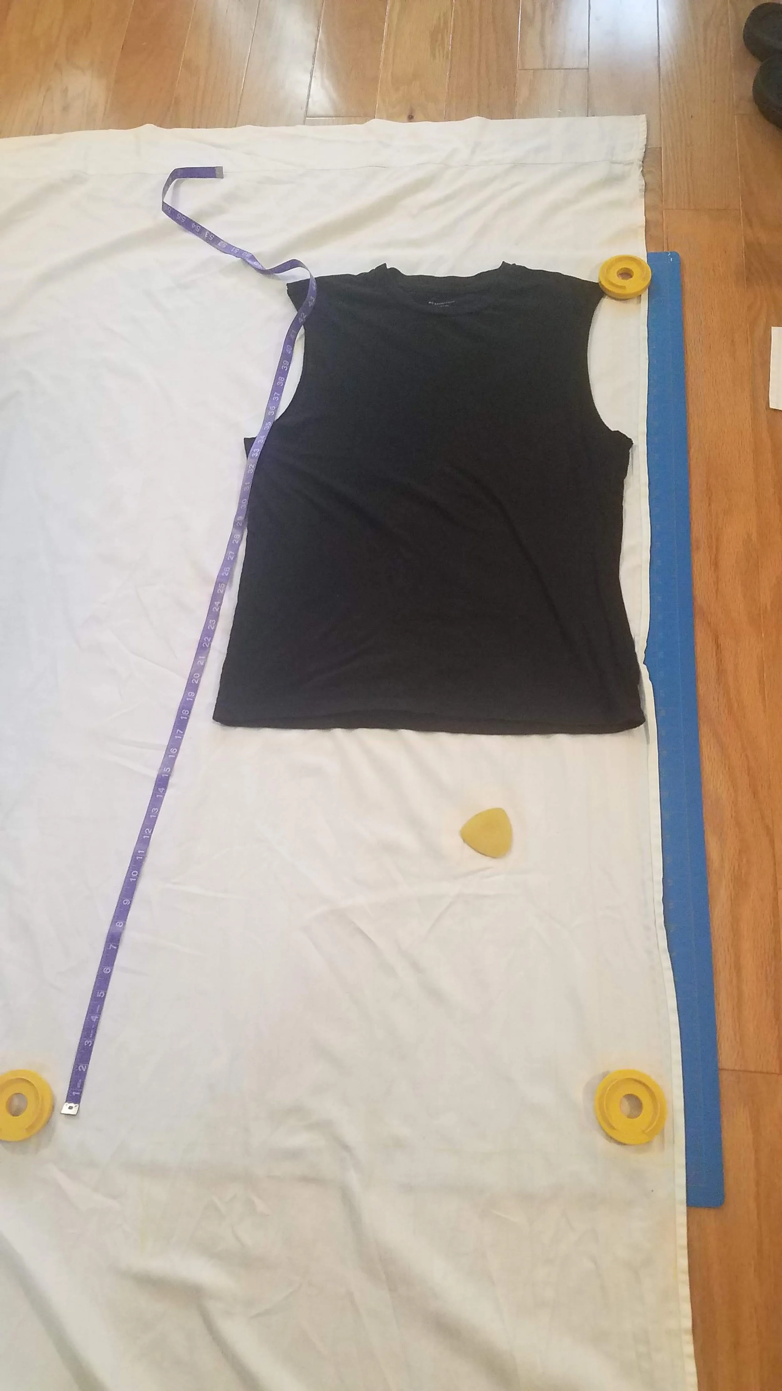 The measurements of my friends and I were similar enough that I used the same pattern for all 4 costumes by tracing my brother’s tank top to get the shape of the shoulders, neckline, and armholes and adding the necessary length in a gentle A-line silhouette. After outlining the front and backs of all 3 tunics in chalk, I cut them out with seam allowance and sewed the shoulder and side seams together. I used myself (Lancelot) and my brother (Concorde) as the model to test the fit and made adjustments as needed.