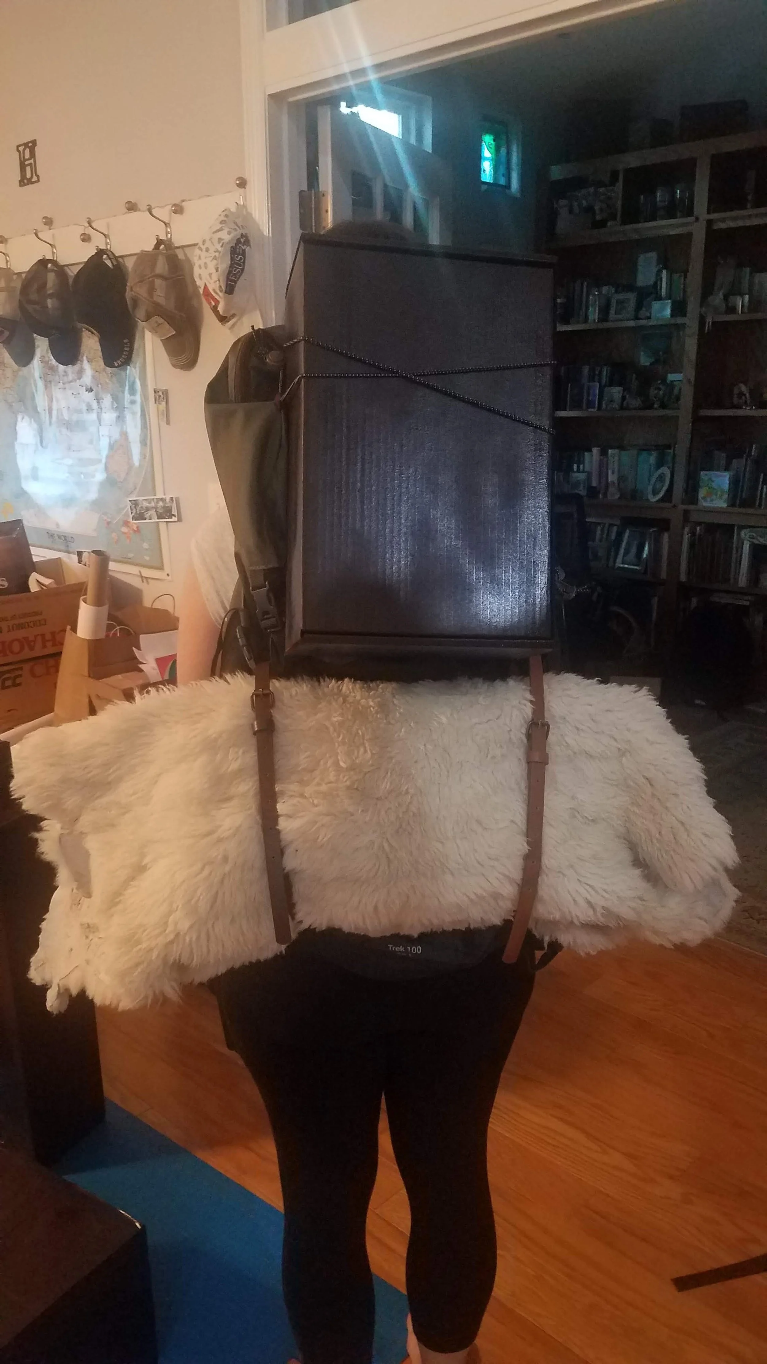Finally, everything was ready for our first Halloween gathering on Saturday October 29. Krista brought over several more belts, a wooden box, and her mom’s olive-green hiking backpack. We first assembled the packs by attaching the flags, boxes, and also rolling up an old sheepskin rug (my dog became obsessed with it ever since I found it in a closet).