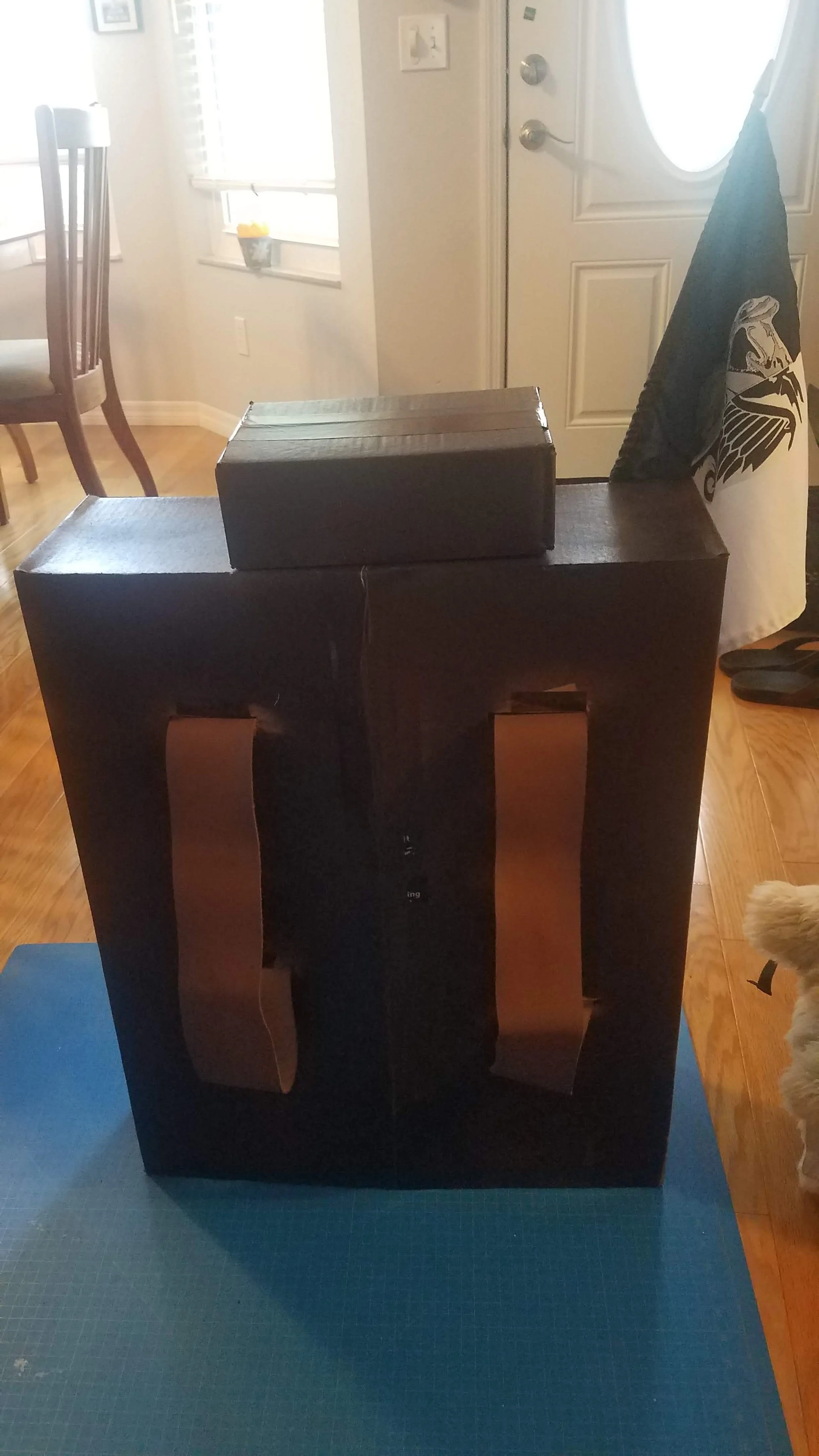 The final step in my preparation was to spray paint cardboard boxes for Patsy and Concorde’s packs. After determining how many we needed and the relative size of each I selected several Amazon boxes from our garage. I also had a bag of random leather scraps that I used for straps. I cut holes in the largest box and glued the straps to the inside of the box before taping it shut. I then wrapped the straps in plastic to protect them from the spray paint. I sprayed the boxes in the garage and waited for them to dry before touching up any patches that showed through.