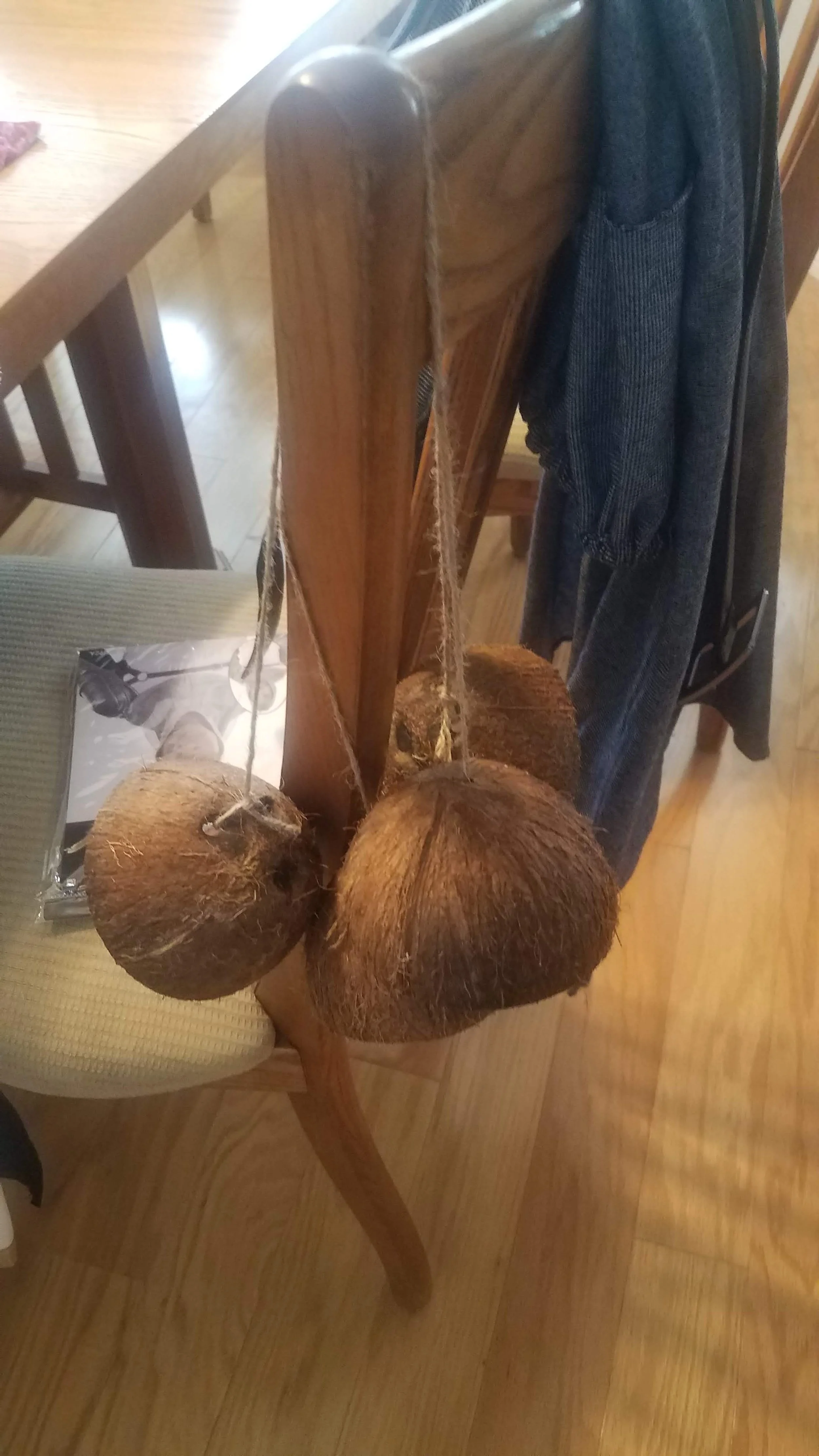 The next to last step was possibly the most important: the coconut “horses”. I bought 2 coconuts and asked my dad to help saw them in half and drill holes in each half so I could string them together. I then tried to scrape the meat out with a grapefruit knife but unfortunately cut my finger badly enough it bled a lot so my dad finished it for me while I tended to my injuries. Eventually, the coconuts were ready and I connected them with twine so they could be looped through a belt.