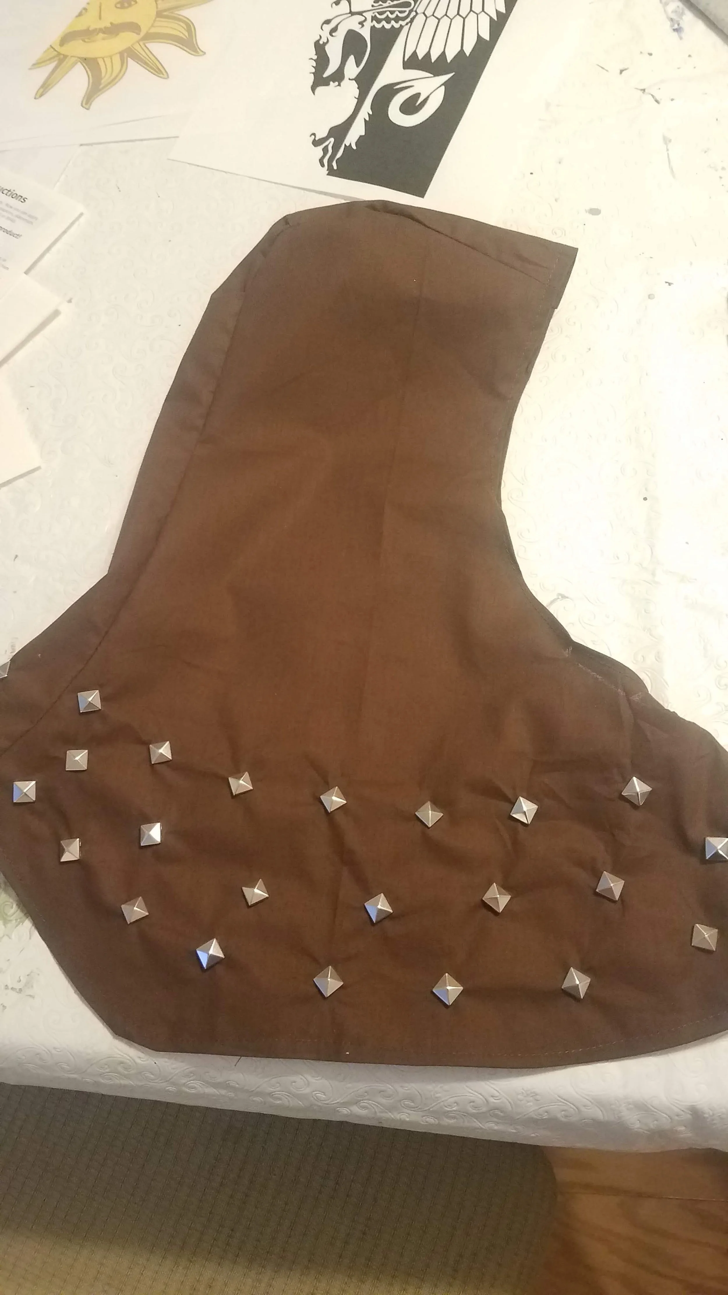 Concorde’s hood needed studs so I counted out the 50 I had bought at Joann’s and placed them where I thought they looked best before attaching them in place. Unfortunately, the fabric is a bit too loose-weave for them to fasten permanently, but I decided glue wouldn’t make enough of a difference so I just hoped for the best and told my brother to be careful wearing it.