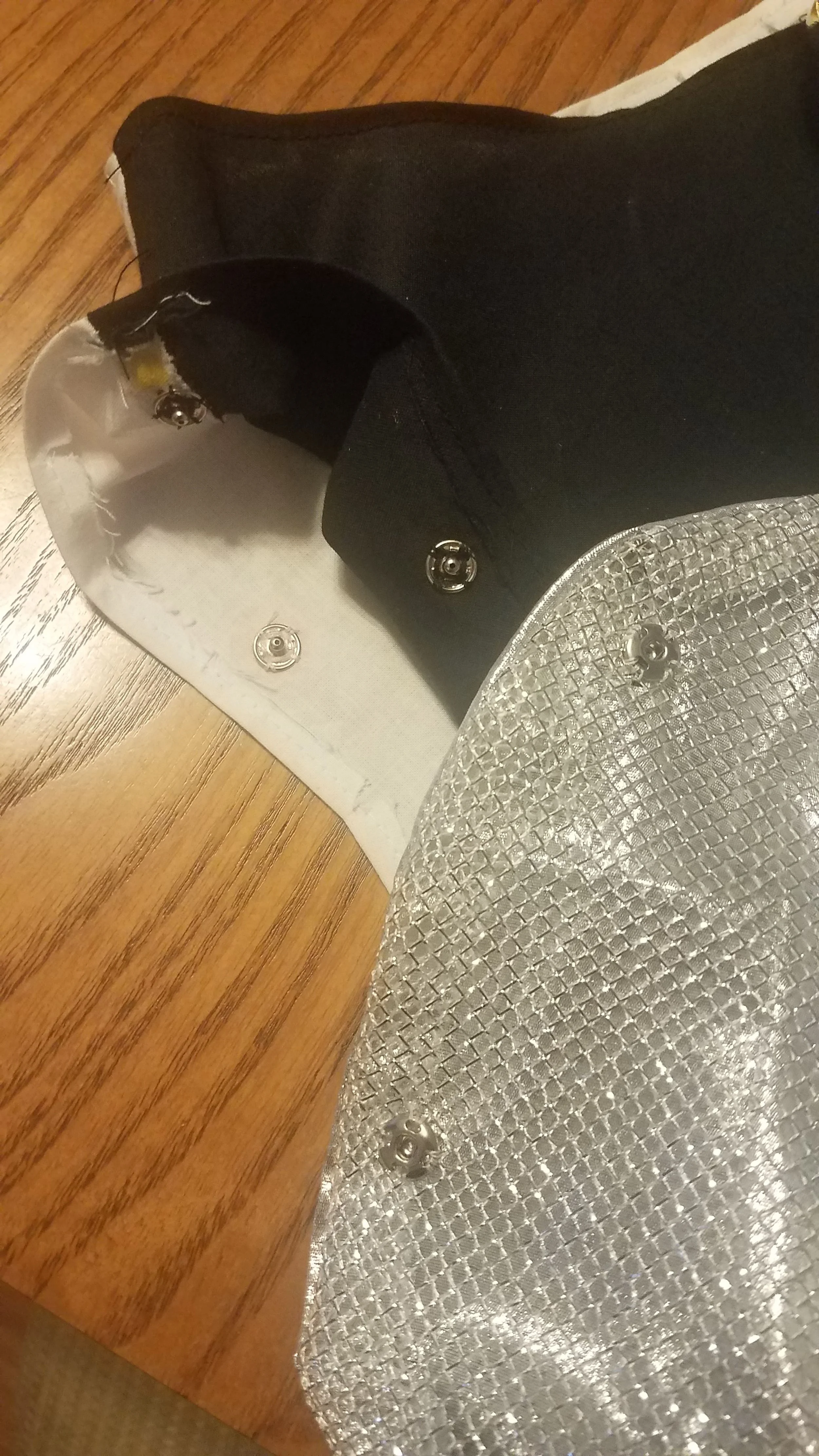 I asked my mom to measure where to attach the sleeves while I wore the costume and she used color coordinate pins to show where each snap needed to go. I sewed 3 snaps on each sleeve and a matching 3 on the tunic (1 at the top of the shoulder, 1 in the front, and 1 in the back). Hand sewing the snaps took a lot of time, but I was able to do it while listening to some podcasts. I then marked the right and left sleeves so they matched the correct armholes.