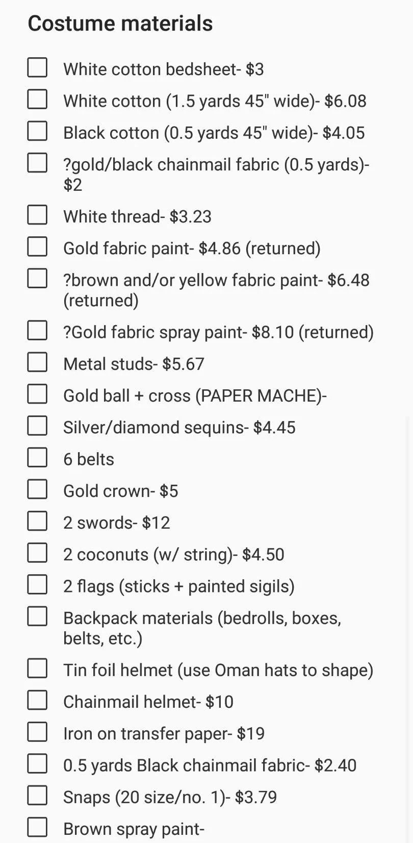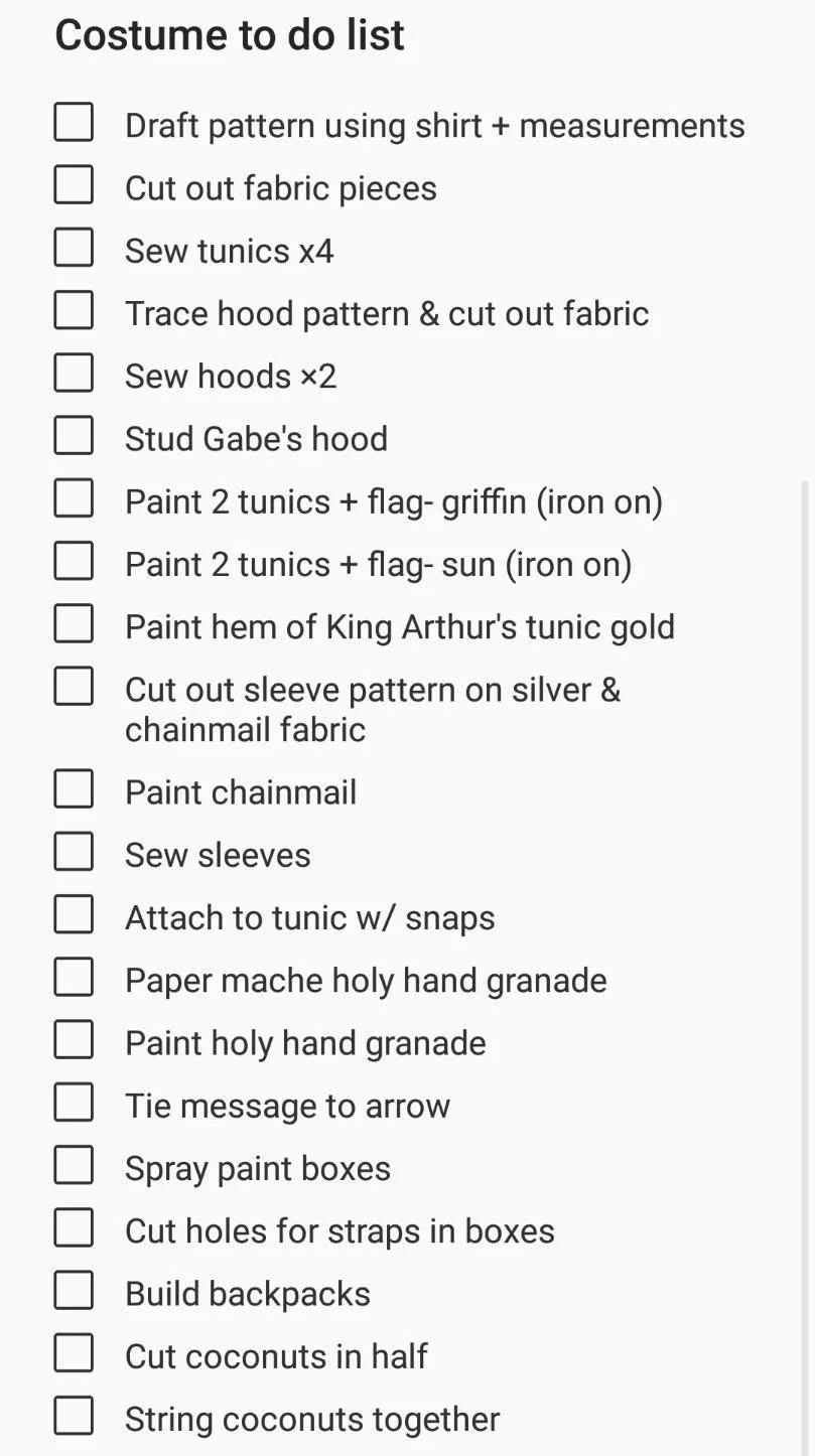 I absolutely love cosplay and sewing so had few qualms about taking on the daunting task of making 4 costumes over the course of about 2 weeks. After deciding who would be which character (in the end we went with Krista=King Arthur, Meghan=Patsy, Myself=Sir Lancelot, & my brother=Concorde), and estimating a budget that everyone would contribute to, the next step was to watch the film and take lots of pictures of the costumes for reference. Then I made a list of supplies I would need to make them. Almost all my materials came from either my own costuming stash, Goodwill, and Joann Fabrics (with the exception of the plastic swords & crown which I bought at Party City). Once I had everything I needed, I sat down at my sewing machine and began.