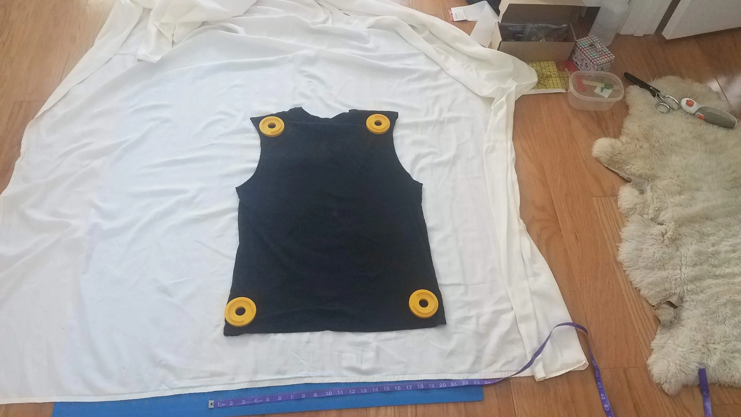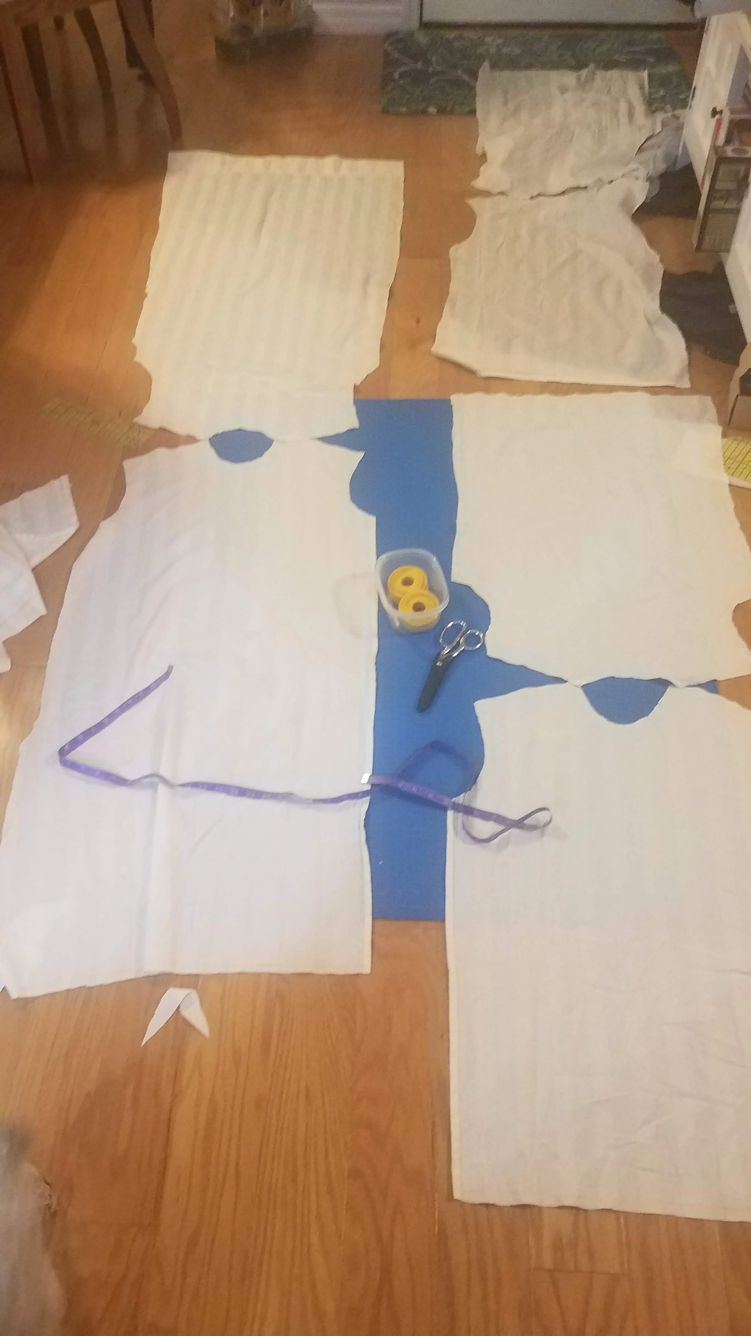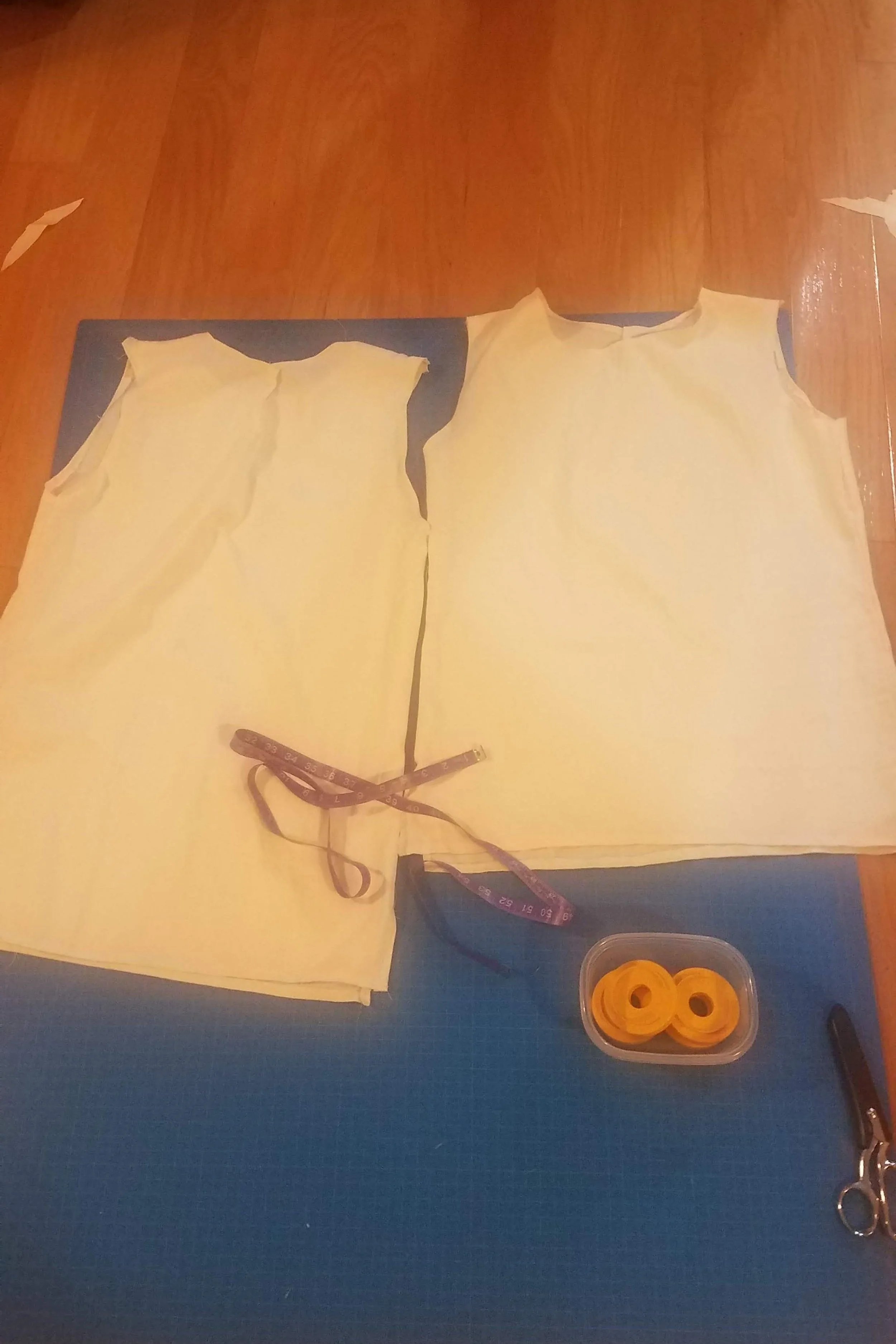 The one downside about using the bed sheet was the lack of any stretch to the fabric, requiring the fit to be perfect. It was a little awkward putting them on but once you got them over your shoulders and chest, the fit was fine. I added a small snap closure to the back to make taking it on and off easier. I also added side slits up to the hips on the 2 short tunics to make it more comfortable to twist and bend. The long tunics already had slits in the costume design.