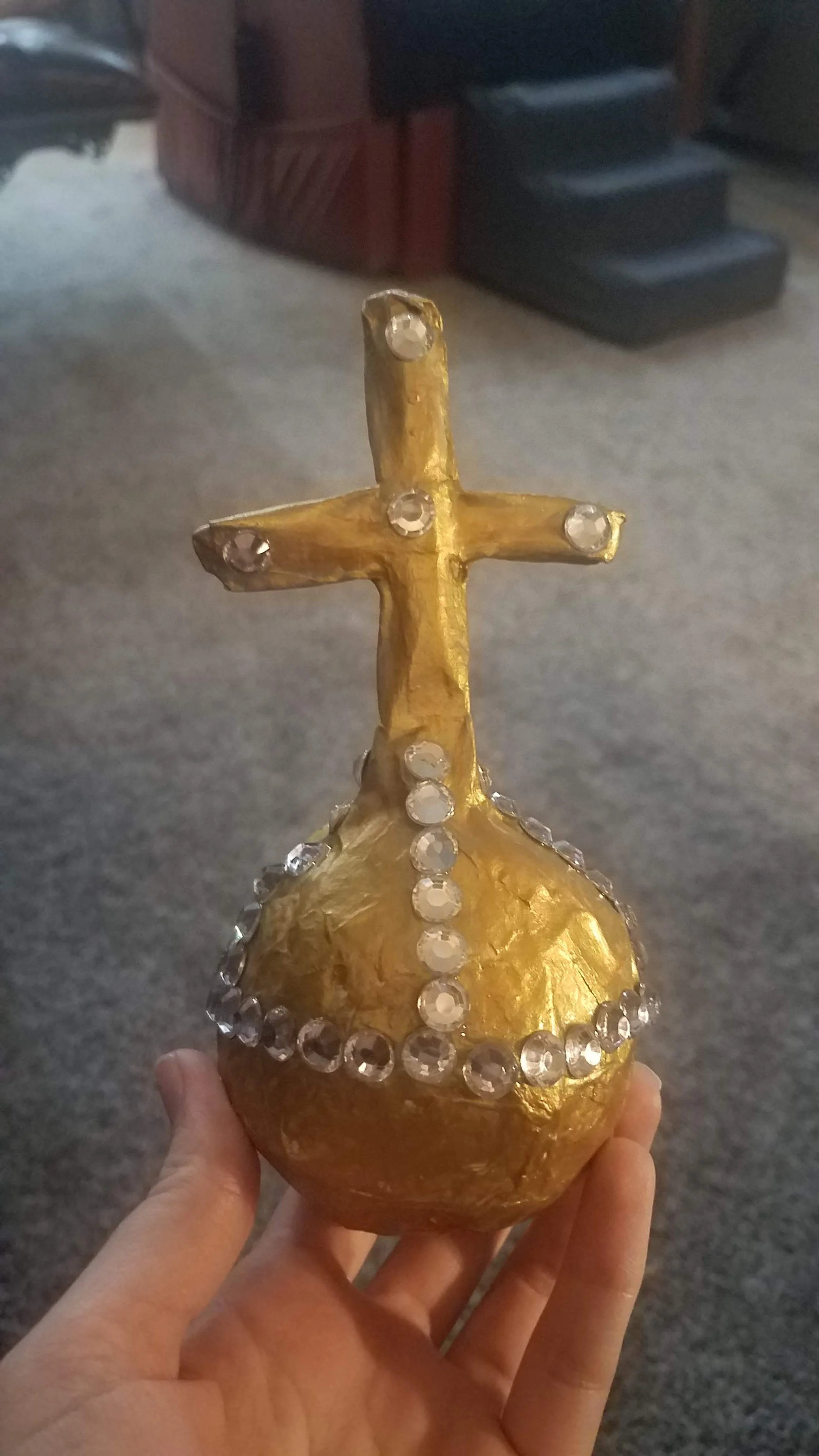 The next day, my other friend Meghan (Patsy) came over for a costume fitting. I let her paint the Holy Hand Grenade gold so it was a group effort and we discussed what clothes she needed to wear underneath the costume. After she left, I let my brother paint the second coat of gold paint on the Holy Hand Grenade before I glued on sequins following the pattern from the movie.