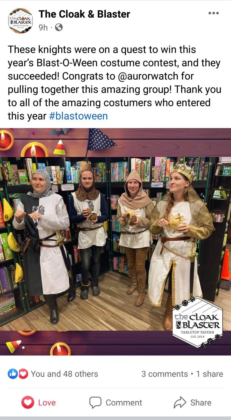 The Cloak & Blaster is a local table-top-gaming tavern that offers great themed food and drink and also board games that tables can rent. They have an annual “Blast-O-Ween” event where lots of people show up in costume and enjoy the spooky atmosphere. We entered their costume contest and then settled into our seats to eat, drink, and play a round or two of the Oregon Trail board game. A fun night was had by all!