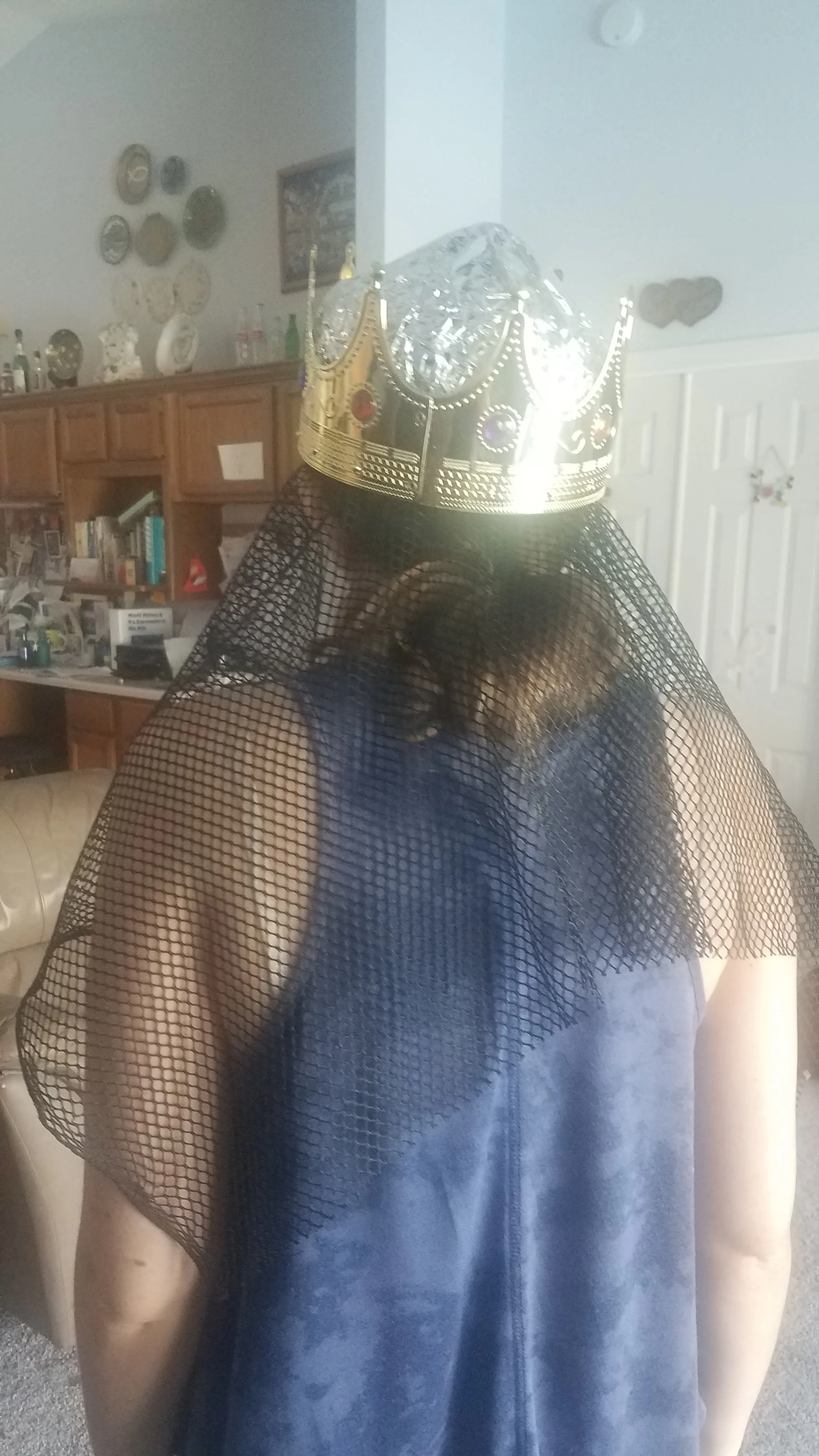 I then took my new scrap of black netting fabric and spray painted it gold to make the chainmail King Arthur wears on his head under his crown. I had barely enough gold spray paint to finish it. To make his silver helmet, I took a traditional hat I got in Oman that had the desired pointy shape and covered it in tin foil before placing it inside the gold plastic crown.