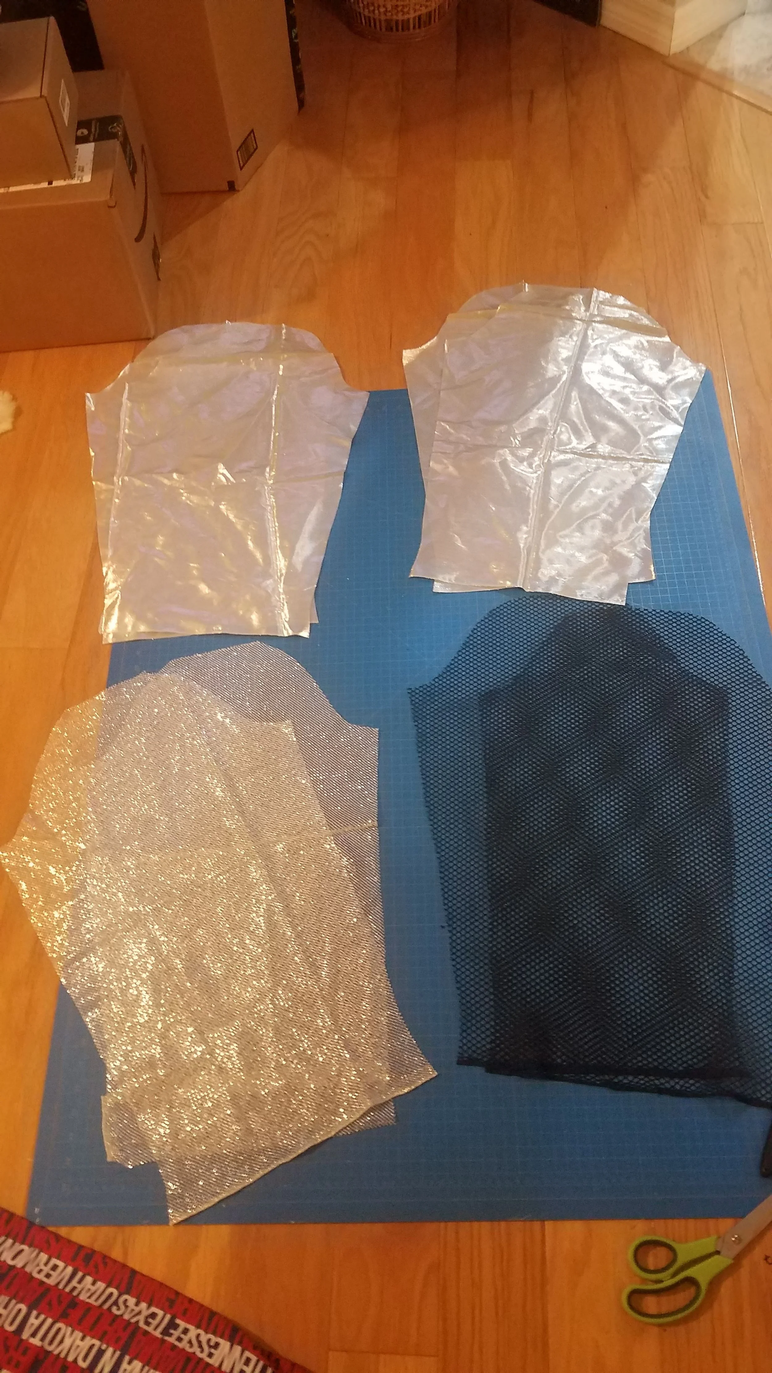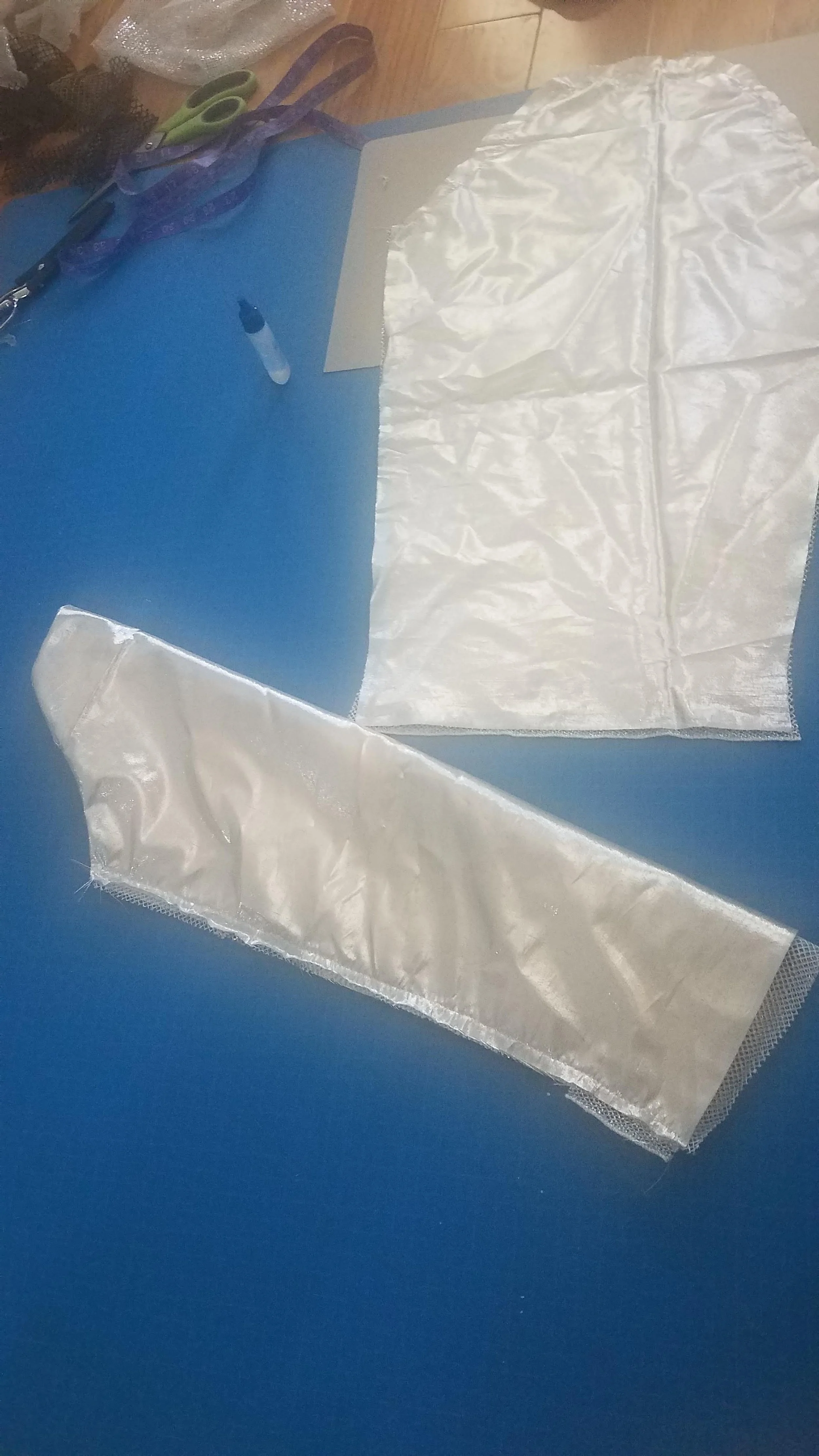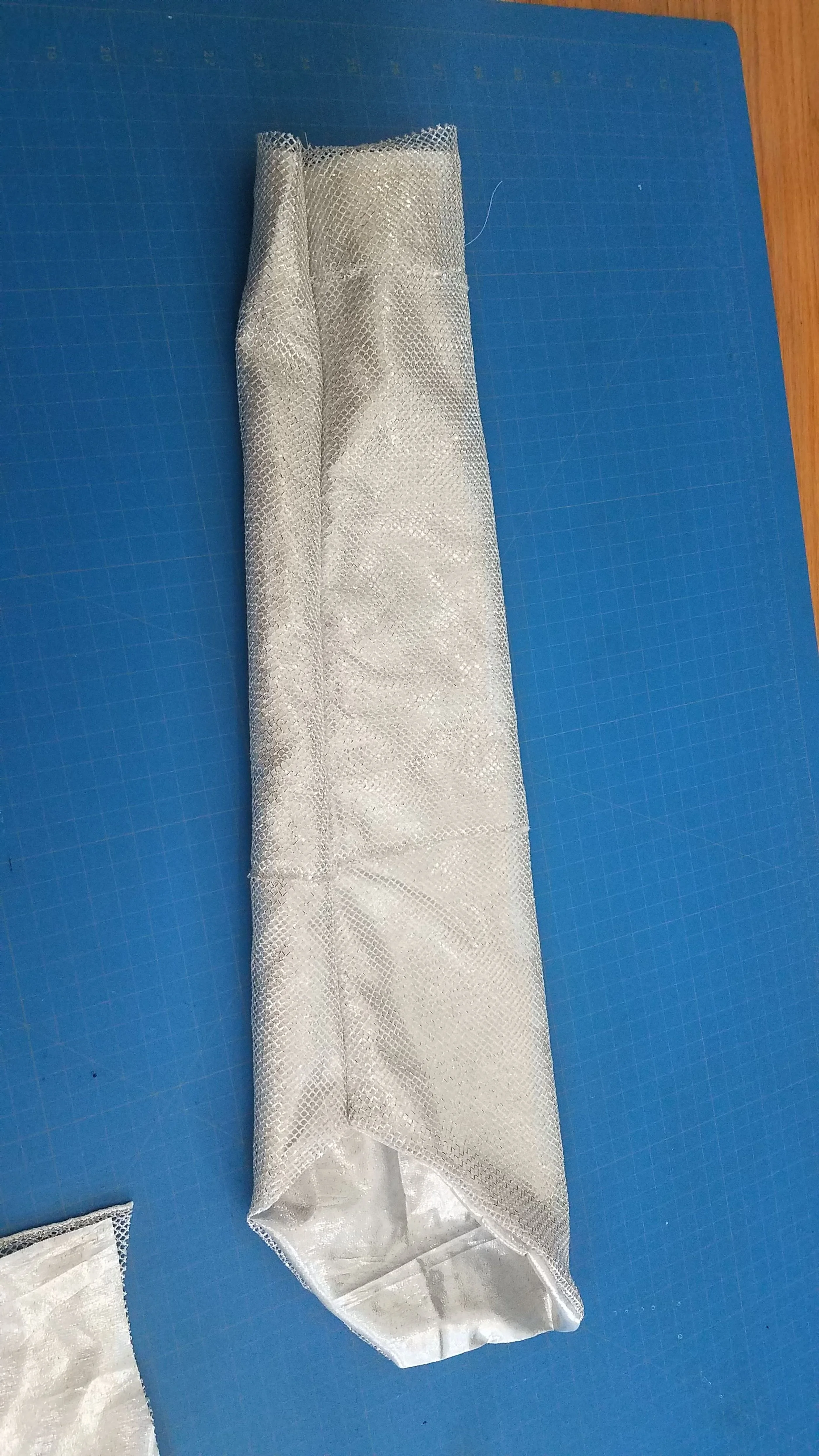 Sleeves are hard to make without a pattern so I searched through our old pattern stash and finally found some “misses” long sleeves I could alter. I cut the pattern piece in half and added a 3 inch strip to make it wide enough for adult arms. I then cut out 4 sleeves in the shiny silver fabric, 2 in the silver chainmail (it required some piecing to make it long enough), and 2 in the black netting. I then sewed just the top seams together so I could flip them right-side-out to make a nice closed top seam. The shiny silver fabric frayed horribly so I covered all the edges with liquid fray check before moving on to the next steps.