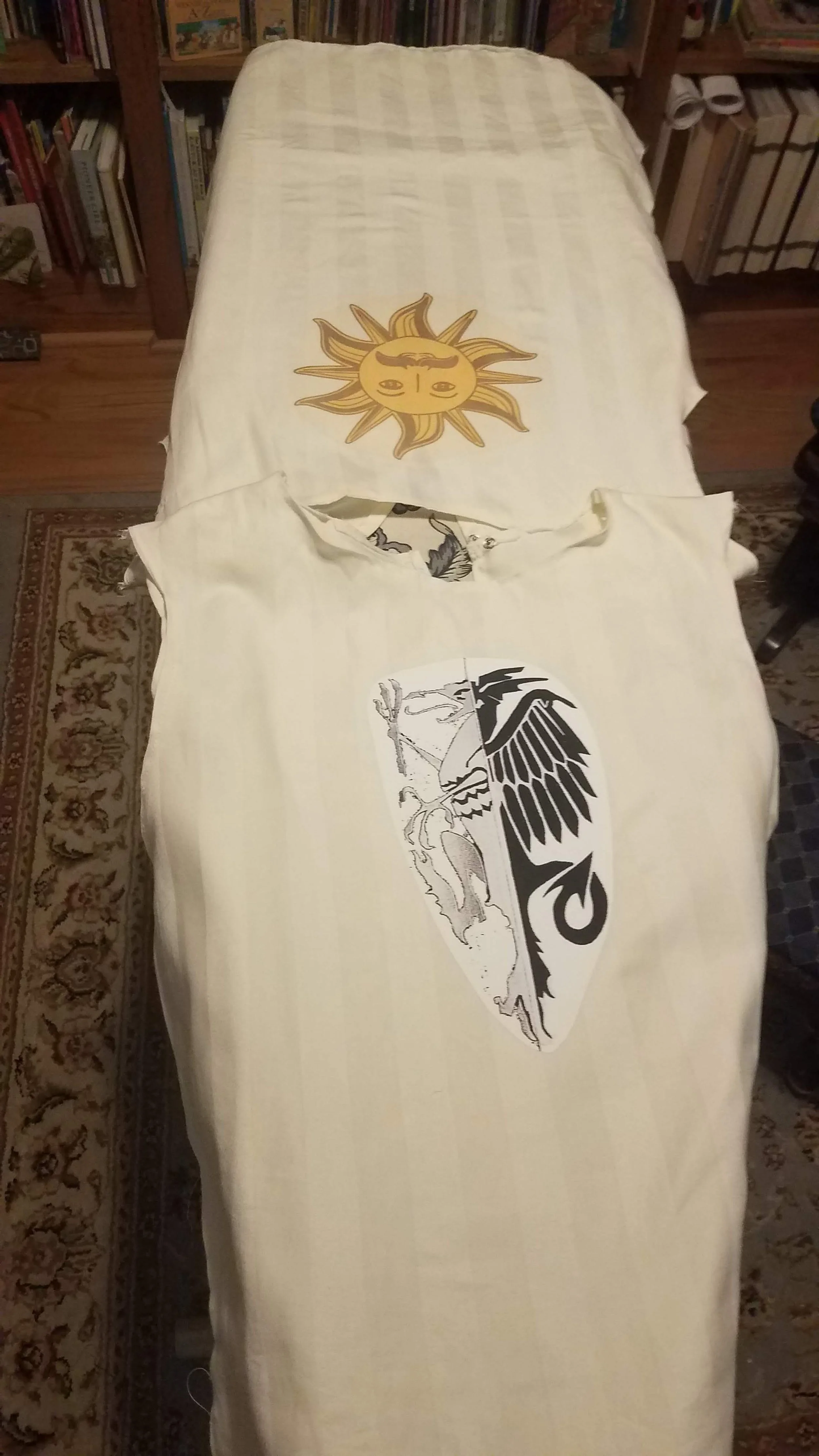 Once the sleeves could be attached and detached, it was time to iron on the sigils to the tunics. I ironed all the wrinkles out of the tunics before carefully centering the sigils on the tunics.