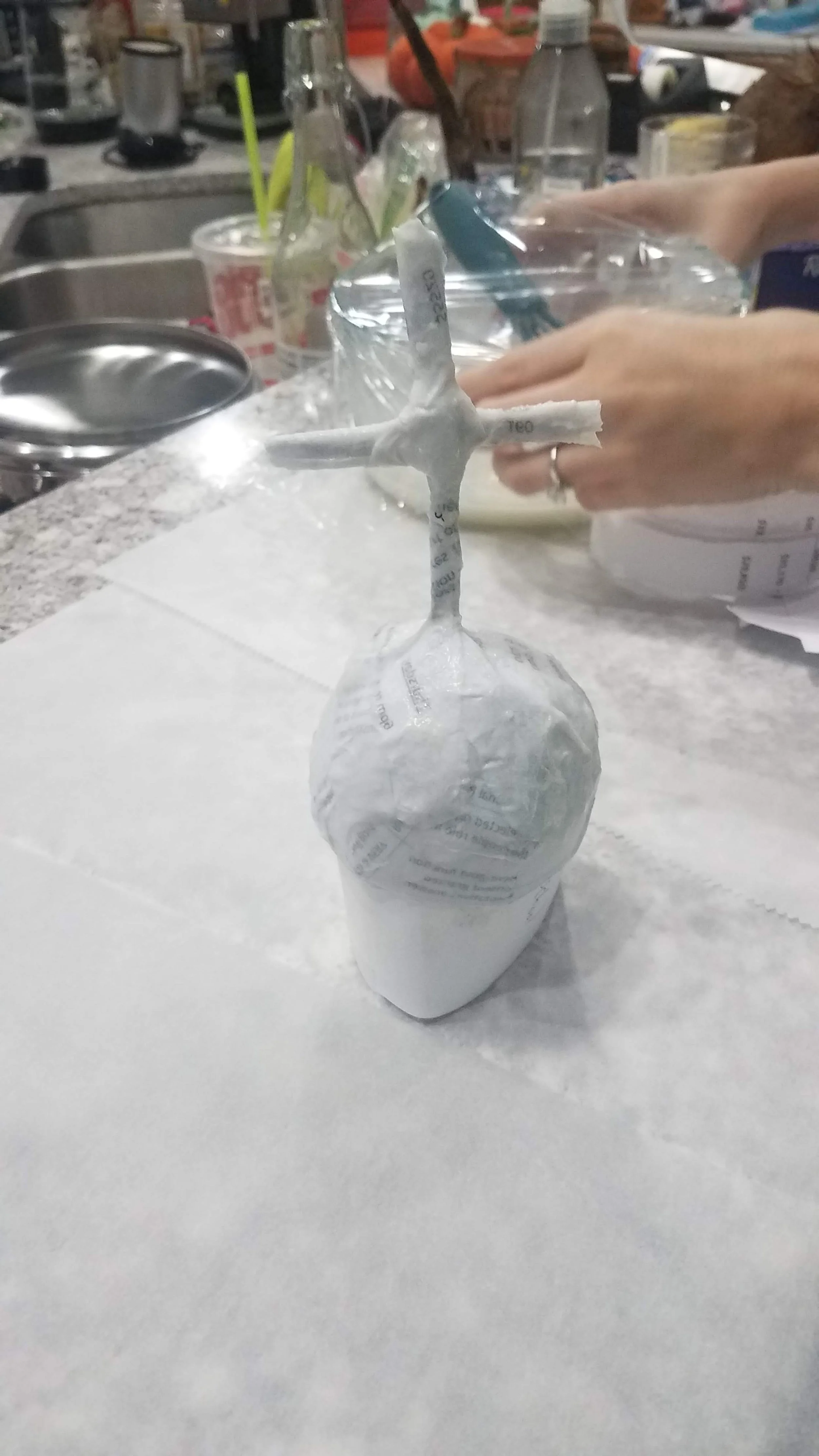 My friend Krista (King Arthur) came over a week before Halloween to see my progress and so I could make sure the costume fit her correctly. Since she wanted to help, we decided to make the Holy Hand Grenade out of Paper Mache. We used a tennis ball as a base covered with a bit of tin foil and a wire cross standing on top. It didn’t look great after the first coat, but once it dried and we added a second coat of Paper Mache it looked much better! Paper Mache takes a long time to dry so I left it overnight under a high fan.