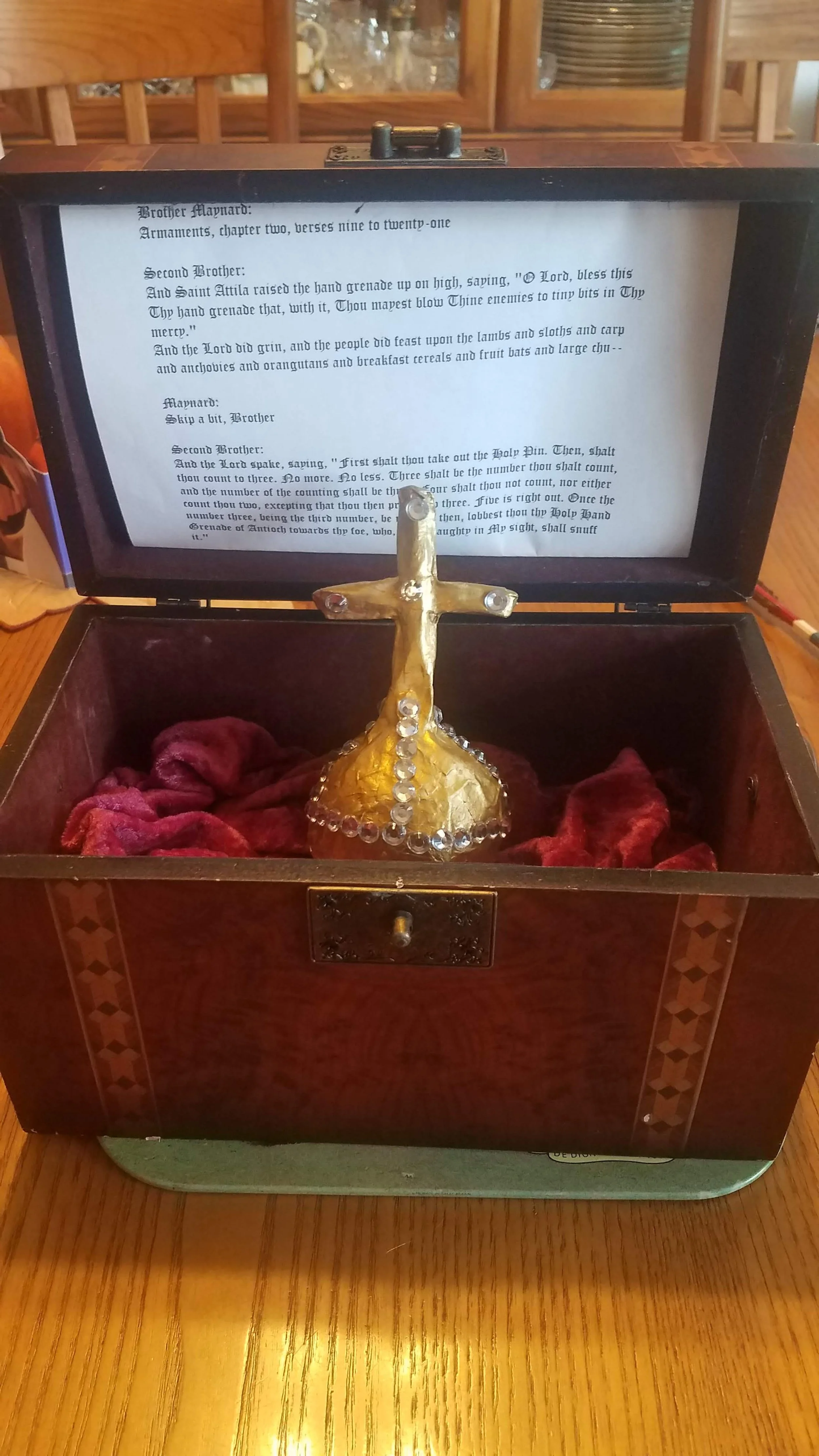 The box for the Holy Hand Grenade (complete with the script for “The Book of Armaments 2:9-21”)